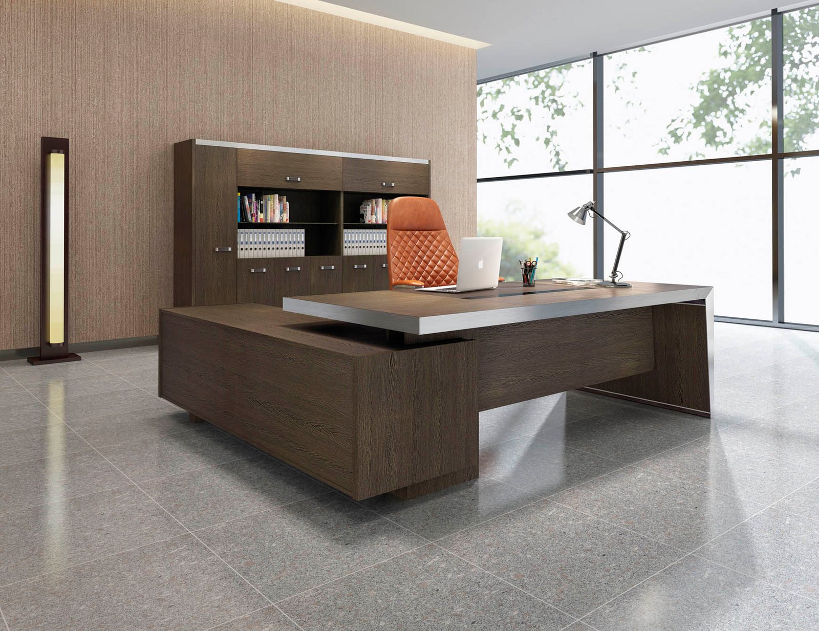 Bureau direction sophistiqué alliant matériaux premium, dimensions généreuses et solutions de rangement intégrées. Finitions luxueuses et détails raffinés.