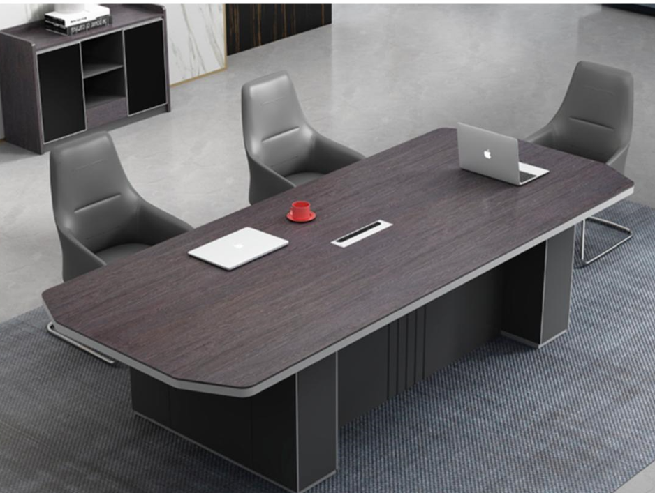 Table de réunion fonctionnelle avec plateau mélaminé robuste, piétement central et passage de câbles discret. Configuration simple pour salles de réunion standard.
