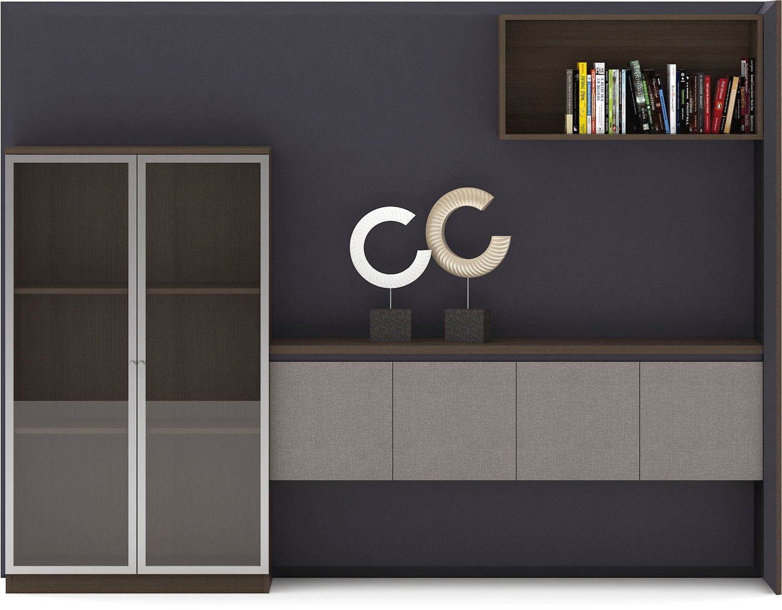 Meuble polyvalent combinant rangement fermé, vitrine d’exposition et fonction table basse. Design pratique pour espaces d’accueil et zones informelles.